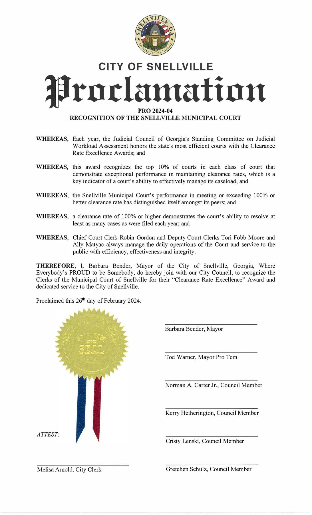 The staff of Snellville’s Municipal Court was honored as one of the state’s most efficient courts Monday with a proclamation by Mayor and Council.