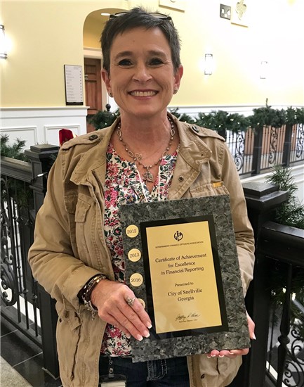 The Certificate was awarded to Snellville Controller Jan Burke for preparing the award-winning CAFR. This is the fourth time Burke was given the award in the four years she has applied for it.