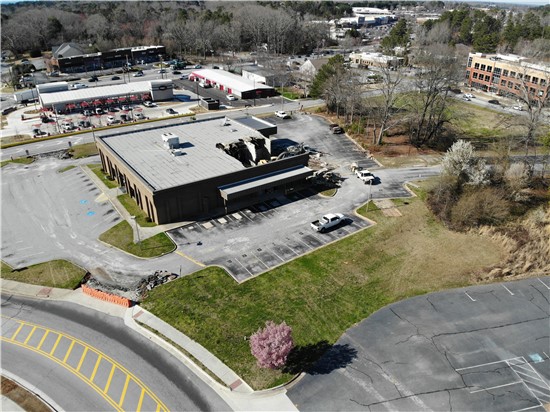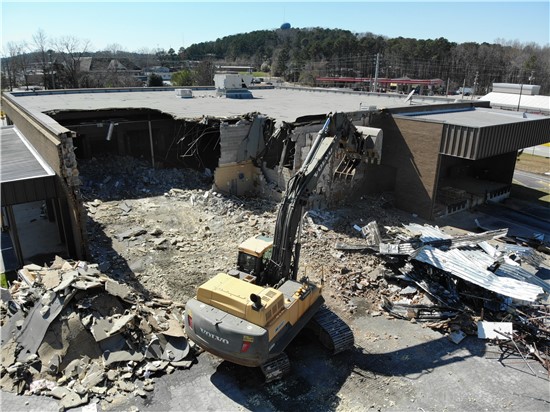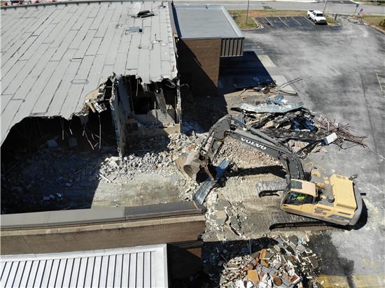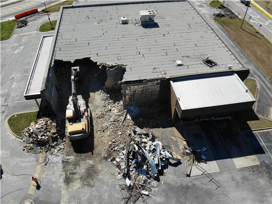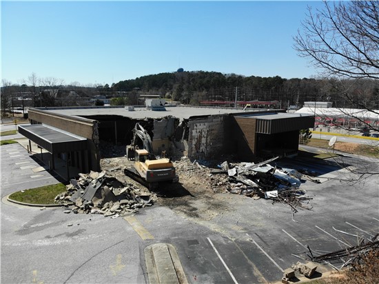 The first demolition on buildings in The Grove at Towne Center began March 8, 2021.