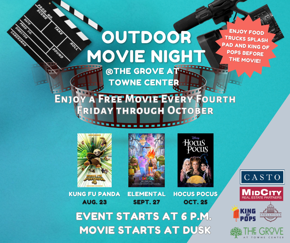 SNELLVILLE – City officials are proud to announce the Fourth Friday Outdoor Movie Series coming to The Grove at Towne Center beginning Aug. 23.