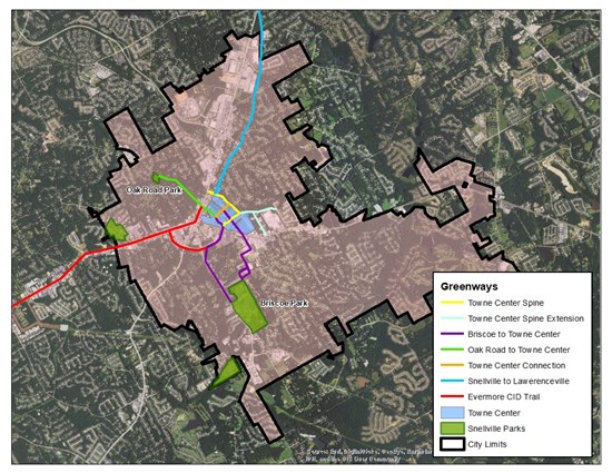 "The goal of the greenway plan for Snellville is to increase walkability and connectivity in the city," said City Planner Austin Shelton. "In some ways the greenway plan is complimentary to the Towne Center. The goal is to create a vibrant, walkable and human-scaled downtown for the city, and the idea behind the greenway plan is to give Snellville residents more options to walk and bike, without having to first drive to a park across town. Having a walkable downtown is all well and good, but if there is no way to actually walk to downtown then we are missing a big piece of the puzzle.The hope is to connect every part of Snellville to downtown and give residents more choice on how they get around."