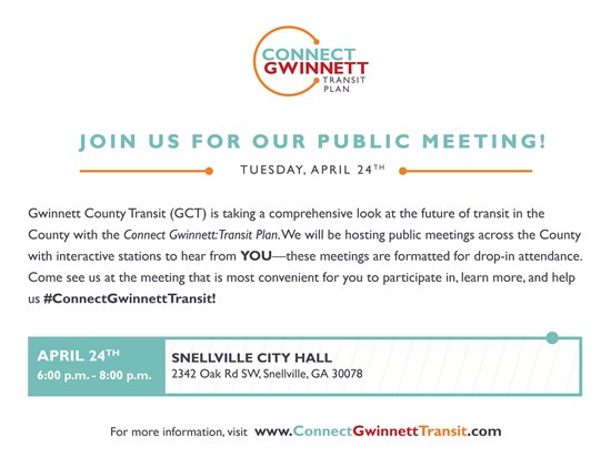 Talks on the Connect Gwinnett Transit Plan will take place from 6 to 8 p.m. April 24 at City Hall, 2342 Oak Road. The meetings are formatted for drop-in attendance.