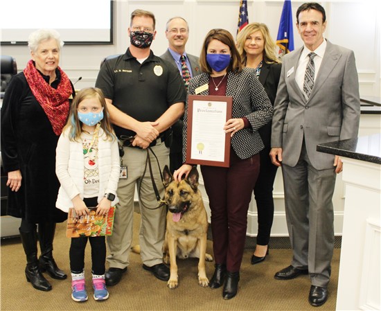 From left, Councilwoman Gretchen Schulz, Emily Matson, Lt. David Matson, Councilman Tod Warner, Mayor Barbara Bender, Councilwoman Cristy Lenski and Mayor Pro Tem Dave Emanuel with K-9 Officer Jax.
