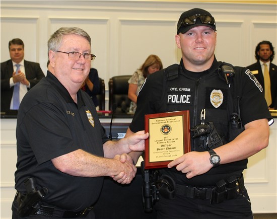 SNELLVILLE – Police officer Brett Chism was honored by City Council Monday for winning a national award after making the largest seizure of MDMA in the country last year.